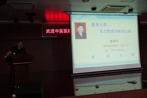 下午两点,讲座正式开始。曾教授以《医务人员压力管理与阳光心态》为题,从医务人员压力调适与管理、努力修炼阳光心态等两方面入手,以“裘法祖的事儿”、“馒头切片”、“天堂与地狱”等小故事,以及深刻贴切地小测试来指导医护人员如何缓解压力,保持乐观的心态。